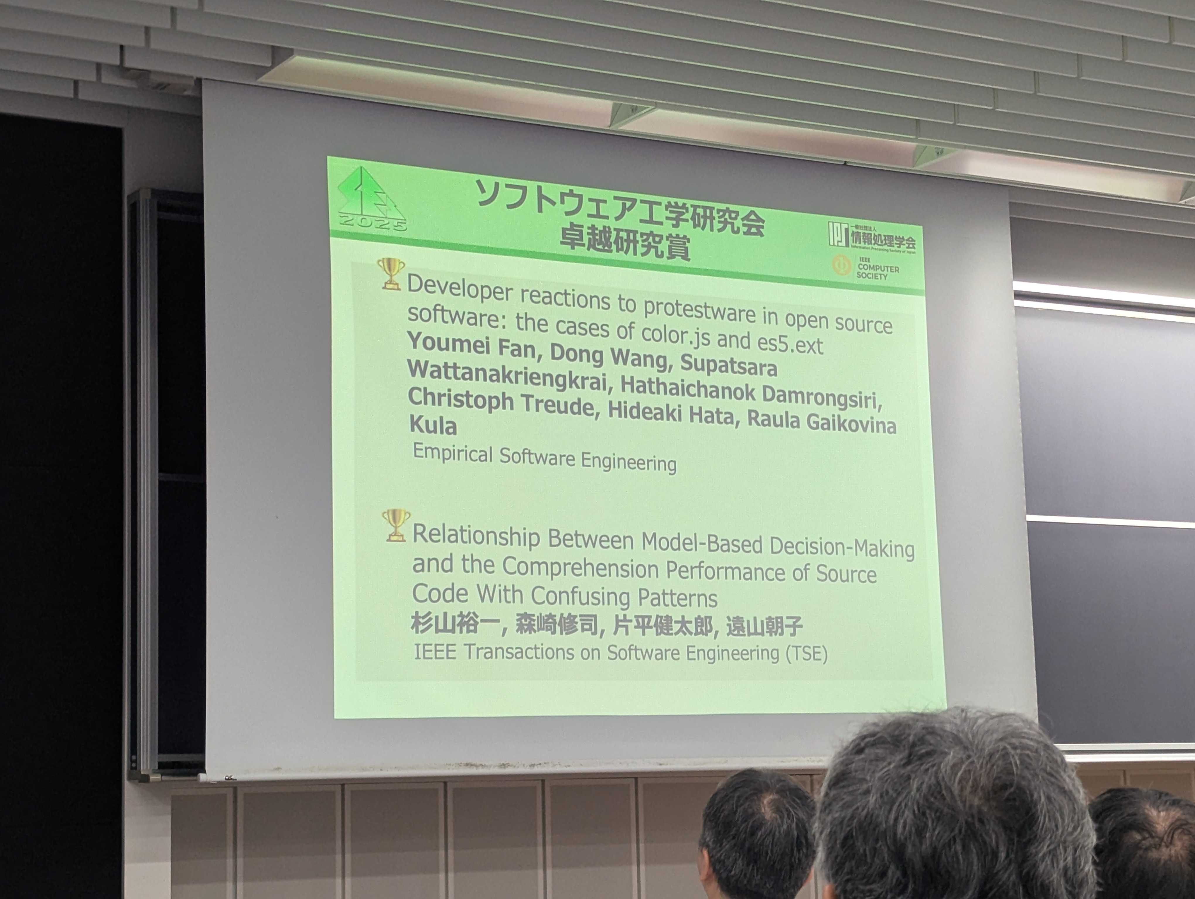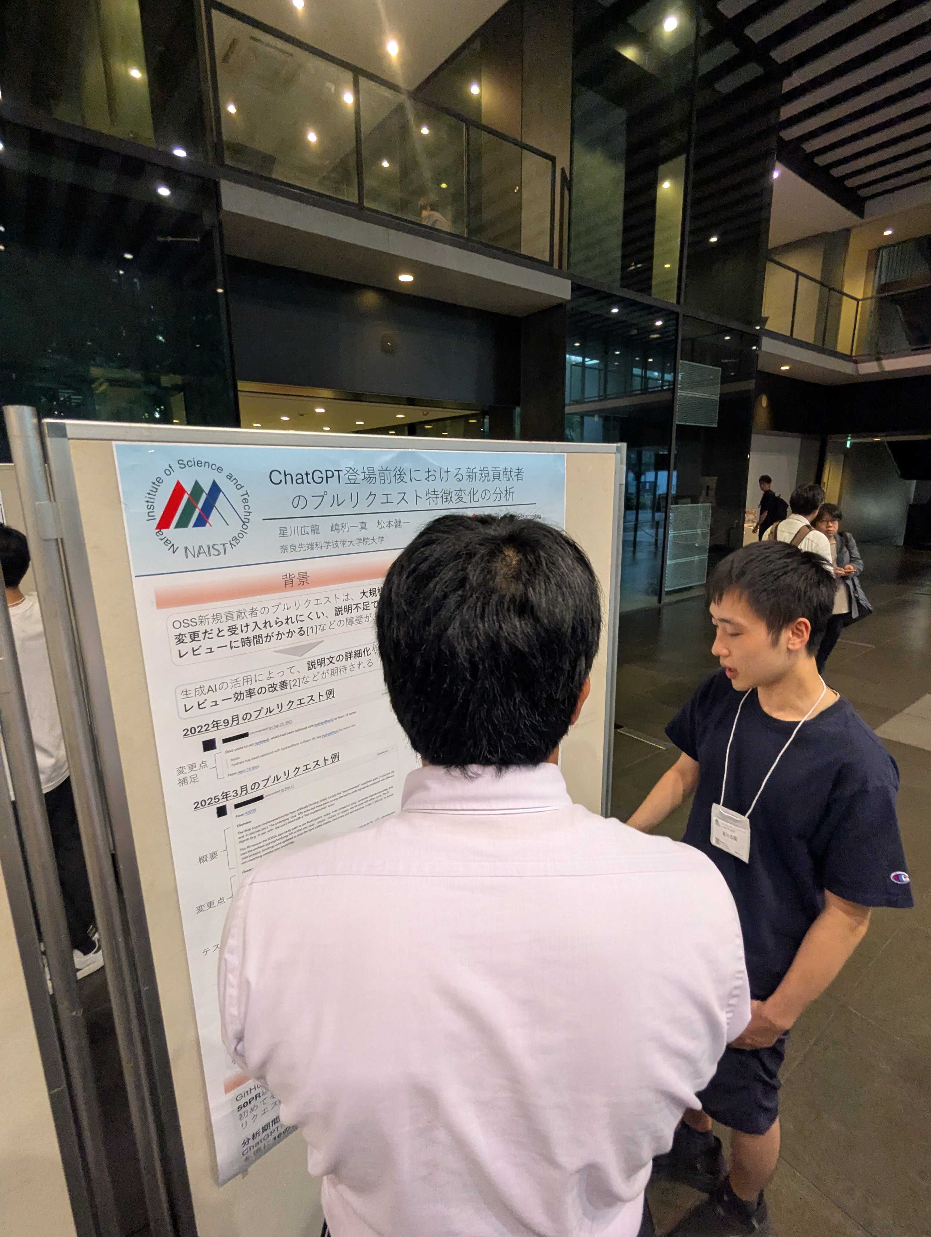 博士前期課程1年の門埜孝拓さん,星川広龍さんが ソフトウェアエンジニアリングシンポジウム2025(SES2025)で発表を行いました. 門埜孝拓さんは一般論文の口頭発表を行い,星川広龍さんがポスター発表(論文なし)を行いました. また,Fan Youmei助教がSIGSE卓越研究賞を受賞しました.